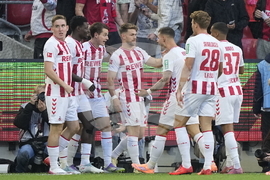 Cologne's Jakub Kaminski, third from left, celebrates after scoring his side's opening goal during the German Bundesliga soccer match between 1.FC Köln and VfB Stuttgart in Cologne, Germany, Sunday, Sept. 28, 2025. (AP Photo/Martin Meissner)