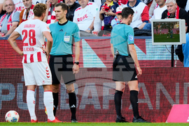 A referee watches the VAR screen during the German Bundesliga soccer match between 1.FC Köln and VfB Stuttgart in Cologne, Germany, Sunday, Sept. 28, 2025. (AP Photo/Martin Meissner)