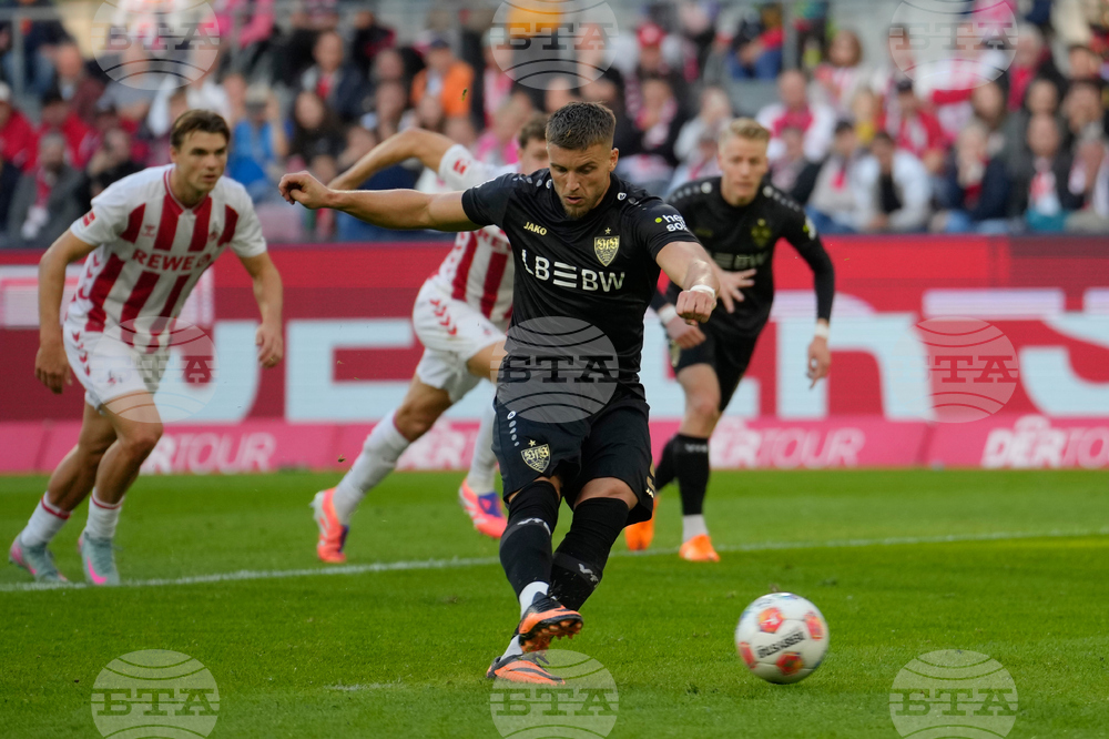 Stuttgart's Ermedin Demirovic scores his side's opening goal from a penalty during the German Bundesliga soccer match between 1.FC Köln and VfB Stuttgart in Cologne, Germany, Sunday, Sept. 28, 2025. (AP Photo/Martin Meissner)