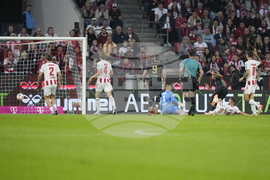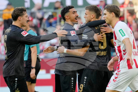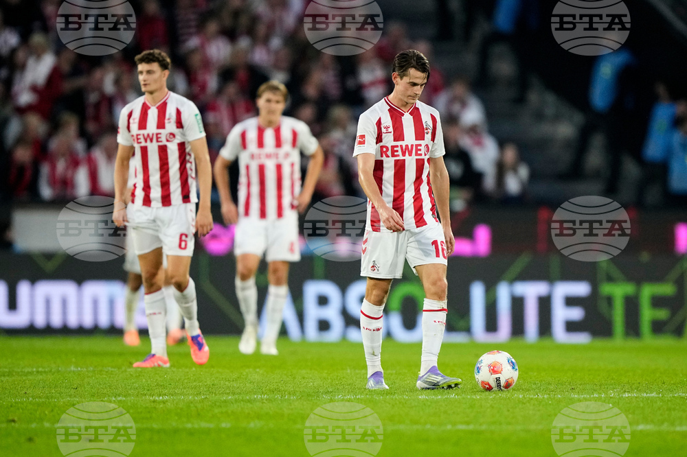 Cologne players react after Stuttgart's Josha Vagnoman, not seen, scored his side's second goal during the German Bundesliga soccer match between Cologne and Stuttgart in Cologne, Germany, Sunday, Sept. 28, 2025. (AP Photo/Martin Meissner)