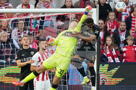 Stuttgart's Ermedin Demirovic is challenged by Cologne's goalkeeper Marvin Schwaebe during the German Bundesliga soccer match between 1.FC Köln and VfB Stuttgart in Cologne, Germany, Sunday, Sept. 28, 2025. (AP Photo/Martin Meissner)