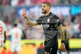 Stuttgart's Jeff Chabot gestures during the German Bundesliga soccer match between Cologne and Stuttgart in Cologne, Germany, Sunday, Sept. 28, 2025. (AP Photo/Martin Meissner)