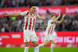 Cologne's Jakub Kaminski celebrates after scoring during the German Bundesliga soccer match between 1. FC Köln and VfB Stuttgart at the RheinEnergieStadion in Cologne, Germany, Sunday, Sept. 28, 2025. (Federico Gambarini/dpa via AP)