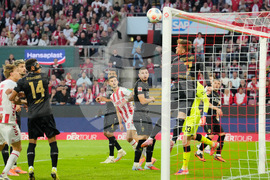 Stuttgart's Luca Jaquez heads the ball during the German Bundesliga soccer match between Cologne and Stuttgart in Cologne, Germany, Sunday, Sept. 28, 2025. (AP Photo/Martin Meissner)
