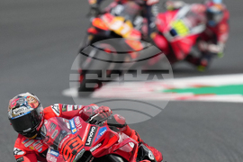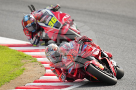 Italian rider Fabio Di Giannantonio of Pertamina Enduro VR46 Racing Team, left, takes a corner during the MotoGP class race of the MotoGP Japanese Grand Prix at the Motegi circuit in Motegi, north of Tokyo, Sunday, Sept. 28, 2025. (AP Photo/Hiro Komae)
