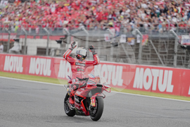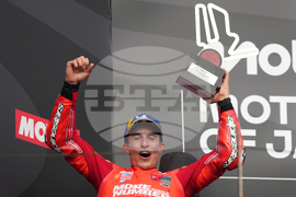 Spanish rider Marc Marquez of Ducati Lenovo Team, celebrates after crossing finishing line during the MotoGP class race of the MotoGP Japanese Grand Prix at the Motegi circuit in Motegi, north of Tokyo, Sunday, Sept. 28, 2025. (AP Photo/Hiro Komae)