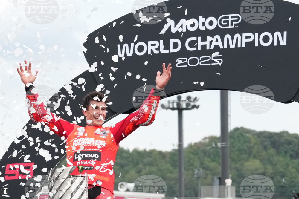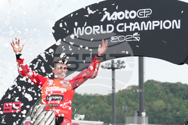 Spanish rider Marc Marquez of Ducati Lenovo Team celebrate after wins his seventh MotoGP title, and ninth world championship at the MotoGP Japanese Grand Prix at the Motegi circuit in Motegi, north of Tokyo, Sunday, Sept. 28, 2025. (AP Photo/Hiro Komae)