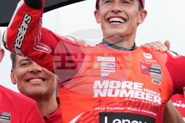 Spanish rider Marc Marquez of Ducati Lenovo Team celebrate with his team after wins his seventh MotoGP title, and ninth world championship at the MotoGP Japanese Grand Prix at the Motegi circuit in Motegi, north of Tokyo, Sunday, Sept. 28, 2025. (AP Photo/Hiro Komae)