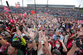Fans celebrates as Spanish rider Marc Marquez of Ducati Lenovo Team after wins his seventh MotoGP title, and ninth world championship at the MotoGP Japanese Grand Prix at the Motegi circuit in Motegi, north of Tokyo, Sunday, Sept. 28, 2025. (AP Photo/Hiro Komae)
