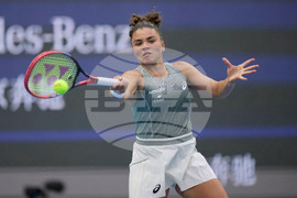 Jasmine Paolini of Italy plays a backhand return to Sofia Kenin of the United States during a women's singles match of the China Open tennis tournament, at the National Tennis Center, in Beijing, China, Sunday, Sept. 28, 2025. (AP Photo/Mahesh Kumar A.)