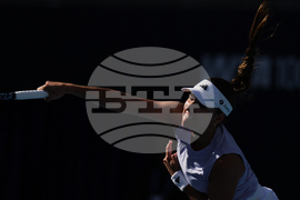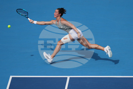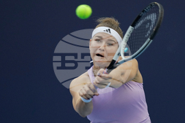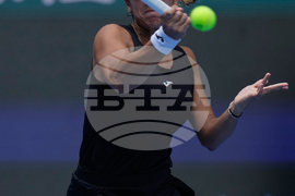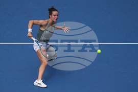 Sofia Kenin of the United States plays a backhand return to Jasmine Paolini of Italy during a women's singles match of the China Open tennis tournament, at the National Tennis Center, in Beijing, China, Sunday, Sept. 28, 2025. (AP Photo/Mahesh Kumar A.)