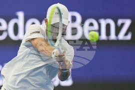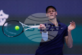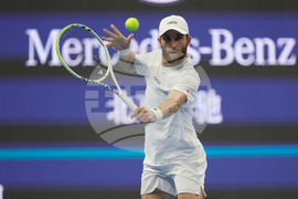 Fabian Marozsan, of Hungary returns a backhand shot to Jannik Sinner, of Italy during a men's singles match of the China Open tennis tournament, at the National Tennis Center, in Beijing, China, Monday, Sept. 29, 2025. (AP Photo/Mahesh Kumar A.)
