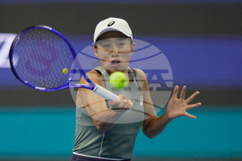Amanda Anisimova of the United States plays a forehand return to Shuai Zhang of China during a women's singles match of the China Open tennis tournament, at the National Tennis Center, in Beijing, China, Sunday, Sept. 28, 2025. (AP Photo/Mahesh Kumar A.)