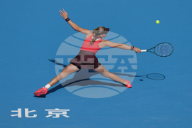 Sofia Kenin of the United States plays a forehand return to Jasmine Paolini of Italy during a women's singles match of the China Open tennis tournament, at the National Tennis Center, in Beijing, China, Sunday, Sept. 28, 2025. (AP Photo/Mahesh Kumar A.)