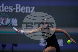 Emma Raducanu, of Britain plays a backhand return to Jessica Pegula, of the United States during the women's singles match for the China Open tennis tournament, in Beijing, Monday, Sept. 29, 2025. (AP Photo/Andy Wong)