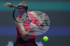 Iga Swiatek, of Poland plays a backhand return to Camila Osorio, of Colombia during the women's singles match for the China Open tennis tournament, in Beijing, Monday, Sept. 29, 2025. (AP Photo/Andy Wong)