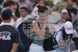 Lois Boisson, of France leaves the court after retired from the women's singles match against Emma Navarro, of the United States, at the China Open tennis tournament, in Beijing, Monday, Sept. 29, 2025. (AP Photo/Andy Wong)