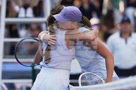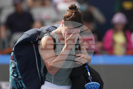 Camila Osorio, of Colombia, left, hugs by Iga Swiatek, of Poland after she retired from the women's singles match for the China Open tennis tournament, in Beijing, Monday, Sept. 29, 2025. (AP Photo/Andy Wong)