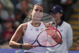 Jessica Bouzas Maneiro, of Spain reacts during the women's singles match against Mirra Andreeva, of Russia, at the China Open tennis tournament, in Beijing, Monday, Sept. 29, 2025. (AP Photo/Andy Wong)
