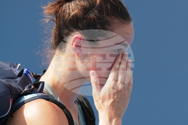 Lois Boisson, of France reacts after losing a point to Emma Navarro, of the United States during the women's singles match for the China Open tennis tournament, at the National Tennis Center, in Beijing, Monday, Sept. 29, 2025. (AP Photo/Andy Wong)