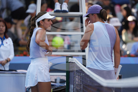 Camila Osorio, of Colombia, left, talks to Iga Swiatek, of Poland after she retired from the women's singles match for the China Open tennis tournament, in Beijing, Monday, Sept. 29, 2025. (AP Photo/Andy Wong)