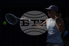 Iga Swiatek, of Poland plays a backhand return to Camila Osorio, of Colombia during the women's singles match for the China Open tennis tournament, at the National Tennis Center, in Beijing, Monday, Sept. 29, 2025. (AP Photo/Andy Wong)