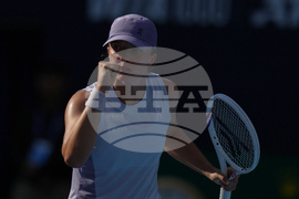 Iga Swiatek, of Poland reacts after scoring a point against Camila Osorio, of Colombia during the women's singles match for the China Open tennis tournament, in Beijing, Monday, Sept. 29, 2025. (AP Photo/Andy Wong)