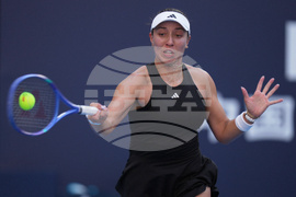 Jessica Pegula, of the United States plays a forehand return to Emma Raducanu, of Britain during the women's singles match for the China Open tennis tournament, at the National Tennis Center, in Beijing, Monday, Sept. 29, 2025. (AP Photo/Andy Wong)
