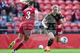 Manchester United's Elisabeth Terland, right, and Liverpool's Gemma Evans battle for the ball during the Women's Super League match between Manchester United and Liverpool at the Totally Wicked Stadium, St Helens, England, Sunday Sept. 28, 2025. (Cody Froggatt/PA via AP)