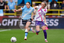 Manchester City's Grace Clinton, left, and London City's Kosovare Asllani in action during the Women's Super League soccer match between Manchester City and London City at the Manchester City Joie Stadium, Manchester, England, Sunday Sept. 28, 2025. (Martin Rickett/PA via AP)