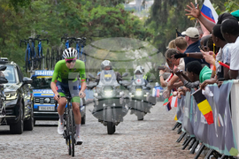 Slovenia's Tadej Pogacar is cheered by spectators as he pedals during the men's Elite road race, at the road cycling World Championships in Kigali, Rwanda, Sunday, Sept. 28, 2025. (AP Photo/Jerome Delay)