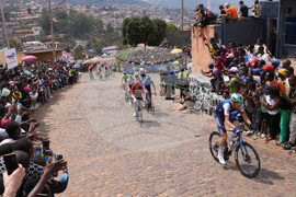Eritrea's Amanuel Gebreigzabhie, left, pedals during the men's Elite road race, at the road cycling World Championships in Kigali, Rwanda, Sunday, Sept. 28, 2025. (AP Photo/Jerome Delay)