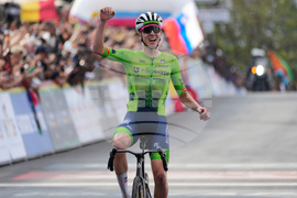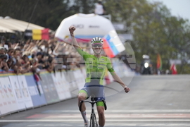 Slovenia's Tadej Pogacar reacts as he crosses the finish line to win the men's Elite road race, at the road cycling World Championships in Kigali, Rwanda, Sunday, Sept. 28, 2025. (AP Photo/Jerome Delay)
