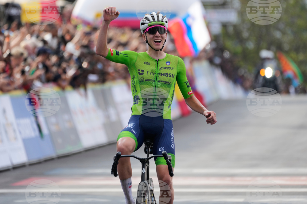 Slovenia's Tadej Pogacar celebrates winning the men's Elite road race, at the road cycling World Championships in Kigali, Rwanda, Sunday, Sept. 28, 2025. (AP Photo/Jerome Delay)