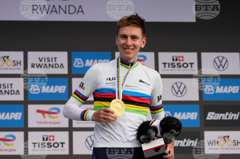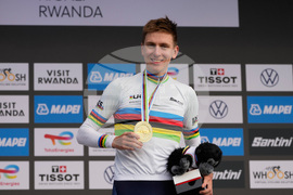 Slovenia's Tadej Pogacar wears the rainbow jersey of the world champion as he stands on the podium after winning the men's Elite road race, at the road cycling World Championships in Kigali, Rwanda, Sunday, Sept. 28, 2025. (AP Photo/Jerome Delay)