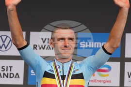 Belgium's Remco Evenepoel poses on the podium with the silver medal of the men's Elite road race, at the road cycling World Championships in Kigali, Rwanda, Sunday, Sept. 28, 2025. (AP Photo/Jerome Delay)