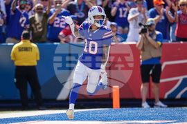 Buffalo Bills wide receiver Khalil Shakir (10) carries for. A touchdown against the New Orleans Saints in the first half of an NFL football game, Sunday, Sept. 28, 2025, in Orchard Park, N.Y. (AP Photo/Sue Ogrocki)
