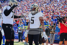 New Orleans Saints running back Kendre Miller (5) carries for a touchdown against Buffalo Bills cornerback Christian Benford in the first half of an NFL football game, Sunday, Sept. 28, 2025, in Orchard Park, N.Y. (AP Photo/Jeffrey T. Barnes)
