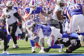 Buffalo Bills tight end Dalton Kincaid (86) crosses the goal line on a touchdown pass against the New Orleans Saints in the second half of an NFL football game, Sunday, Sept. 28, 2025, in Orchard Park, N.Y. (AP Photo/Jeffrey T. Barnes)