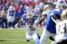 Buffalo Bills running back James Cook (4) carries against the New Orleans Saints in the first half of an NFL football game, Sunday, Sept. 28, 2025, in Orchard Park, N.Y. (AP Photo/Sue Ogrocki)