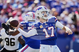 Buffalo Bills quarterback Josh Allen (17) passes against the New Orleans Saints in the first half of an NFL football game, Sunday, Sept. 28, 2025, in Orchard Park, N.Y. (AP Photo/Sue Ogrocki)