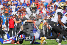 New Orleans Saints running back Kendre Miller (5) carries against Buffalo Bills safety Cole Bishop (24) in the first half of an NFL football game, Sunday, Sept. 28, 2025, in Orchard Park, N.Y. (AP Photo/Sue Ogrocki)