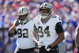 New Orleans Saints defensive end Cameron Jordan (94) celebrates his sack in the first half of an NFL football game against the Buffalo Bills, Sunday, Sept. 28, 2025, in Orchard Park, N.Y. (AP Photo/Sue Ogrocki)