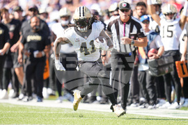 New Orleans Saints running back Alvin Kamara (41) carries against the Buffalo Bills in the second half of an NFL football game, Sunday, Sept. 28, 2025, in Orchard Park, N.Y. (AP Photo/Sue Ogrocki)