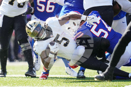 New Orleans Saints running back Velus Jones Jr. (13) carries against the Buffalo Bills in the first half of an NFL football game, Sunday, Sept. 28, 2025, in Orchard Park, N.Y. (AP Photo/Sue Ogrocki)