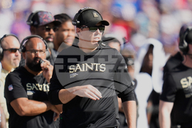 New Orleans Saints head coach Kellen Moore walks on the sideline in the second half of an NFL football game against the Buffalo Bills, Sunday, Sept. 28, 2025, in Orchard Park, N.Y. (AP Photo/Sue Ogrocki)