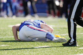 Buffalo Bills punter Cameron Johnston lies on the turf after being hit by New Orleans Saints linebacker Nephi Sewell (45) in the second half of an NFL football game, Sunday, Sept. 28, 2025, in Orchard Park, N.Y. (AP Photo/Sue Ogrocki)