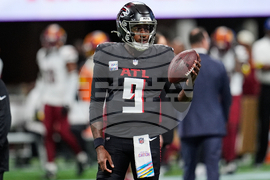 Atlanta Falcons quarterback Michael Penix Jr. (9) warms up before an NFL football game against the Washington Commanders, Sunday, Sept. 28, 2025, in Atlanta. (AP Photo/Mike Stewart)