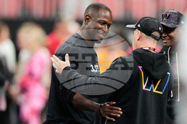 Atlanta Falcons head coach Raheem Morris speaks after an NFL football game between the Atlanta Braves and the Pittsburgh Pirates, Sunday, Sept. 28, 2025, in Atlanta. (AP Photo/Mike Stewart)