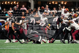 Atlanta Falcons quarterback Kirk Cousins (18) warms up before an NFL football game against the Washington Commanders, Sunday, Sept. 28, 2025, in Atlanta. (AP Photo/Mike Stewart)